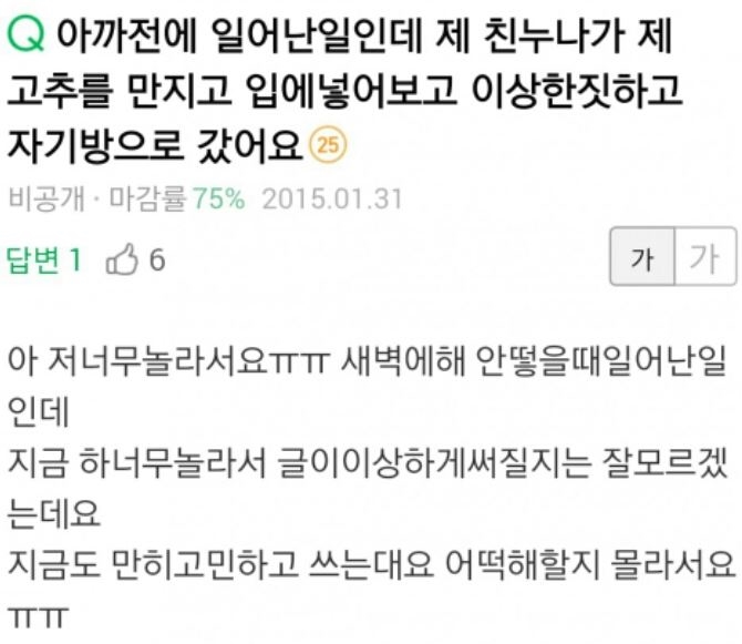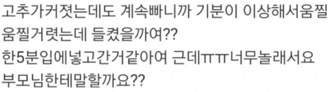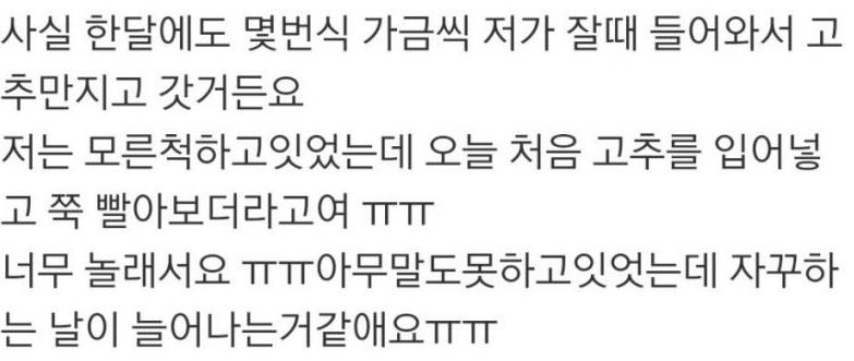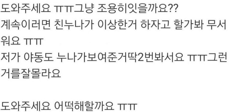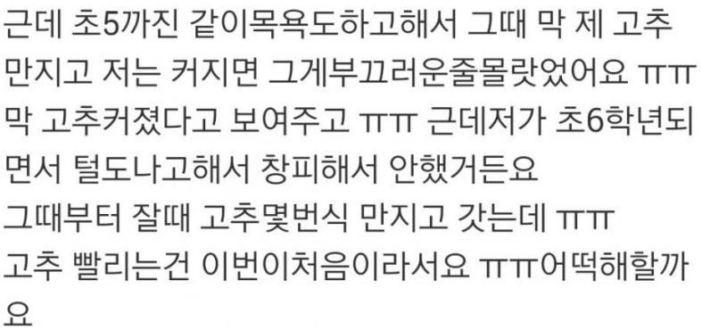 한 온라인 커뮤니티에는 “아까전에 일어난일인데 제 친구나가 제 꼳chu를 만지고 입에 넣어보고 이상한짓하고 자기방으로 갔어요”라는 제목의 글이 올라와 누리꾼들 사이에서 화제가 되고 있다.