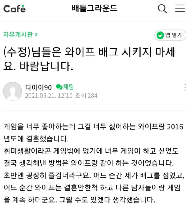 최근 온라인 커뮤니티에 올라온 “님들은 와이프 배그 시키지 마세요. 바람납니다.”라는 제목의 게시글이 화제다.