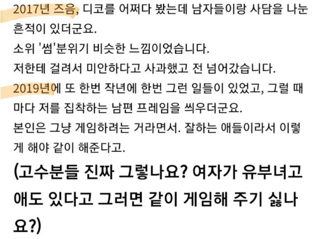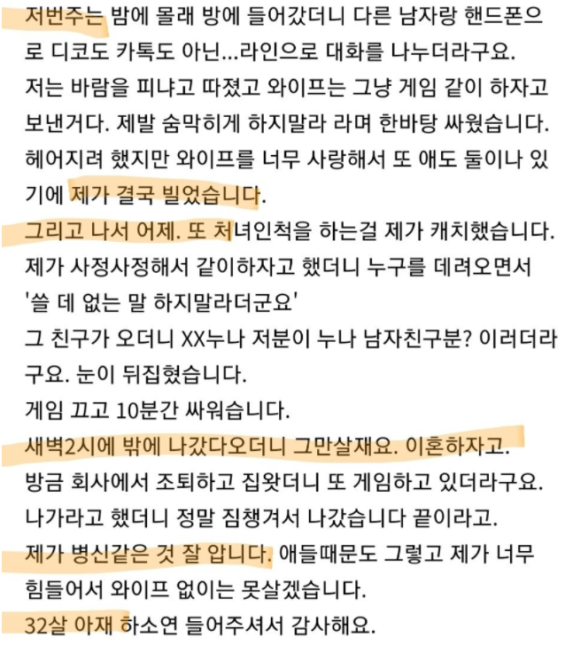 이어서 글쓴이는 “아내가 어느순간 미혼인척 다른 남자들과 게임을 계속하더니 결국 카톡으로 대화까지 하더군요.”라고 말을 덧붙였다.
