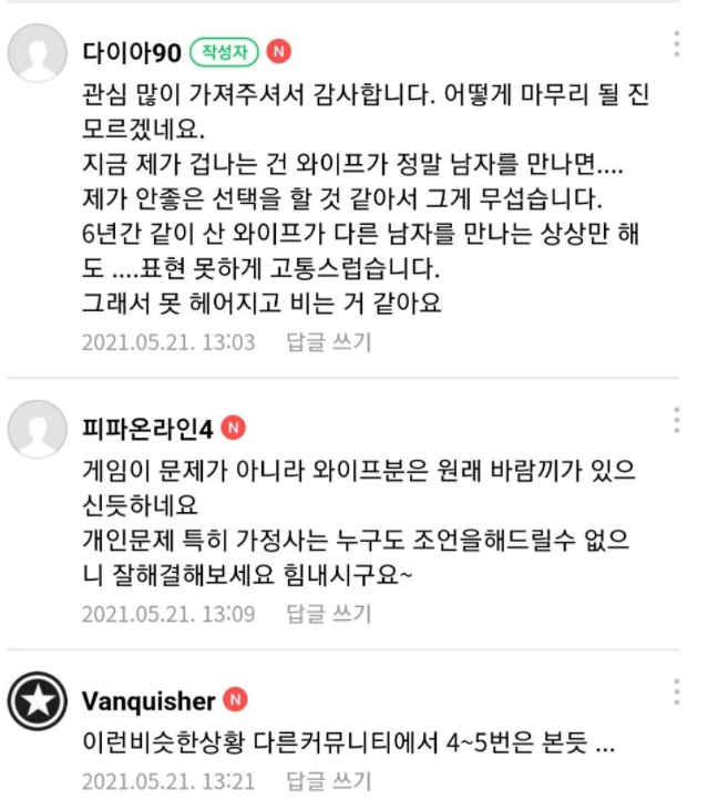 이를 본 온라인 커뮤니티 네티즌들은 “이건 그냥 사람 문제인 것 같습니다. 굳이 게임 때문이 아니어도 바람피지 않았을까요?”, “여왕벌 놀이 하다 보면 자연스럽게 남자들이 꼬이긴 하죠. 힘내세요.”라는 반응을 보였다.