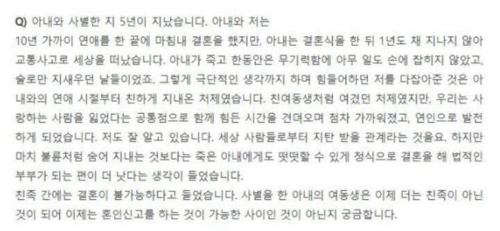 그는 “사별을 한 아내의 여동생은 이제 더는 친족이 아닌 것이 되어 이제는 혼인신고를 하는 것이 가능한 사이인지 궁