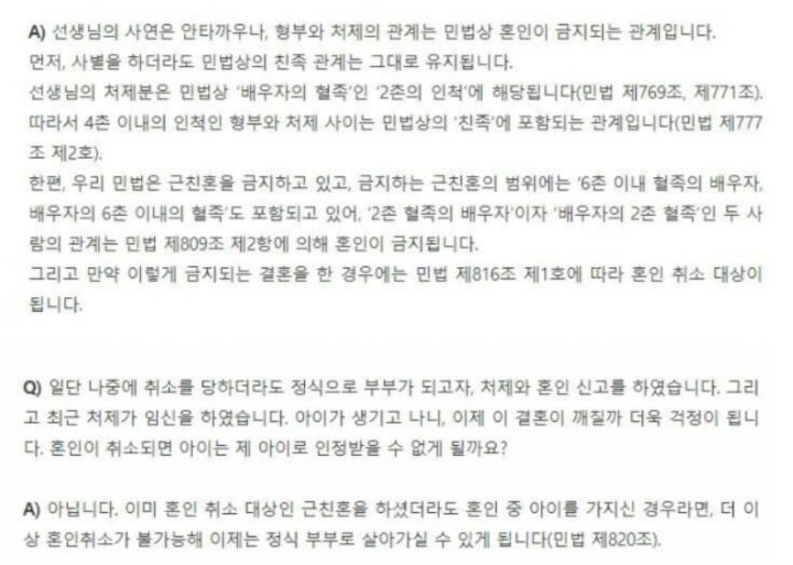 이런 답을 듣자 변호사는 “아닙니다. 이미 혼인 취소 대상인 근친혼을 하셨더라도 혼인 중 아이를 가지신 경우라면, 더 이상 혼인취소가 불가능해 이제는 정식 부부로 살아가실 수 있게 됩니다(민법 제820조)”라고 답변했다.