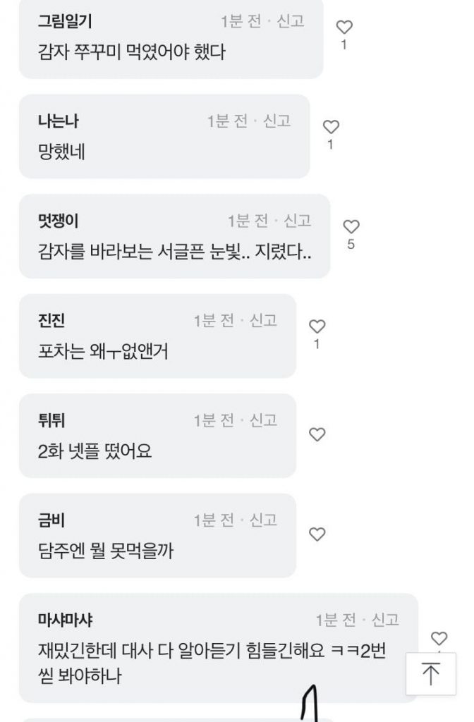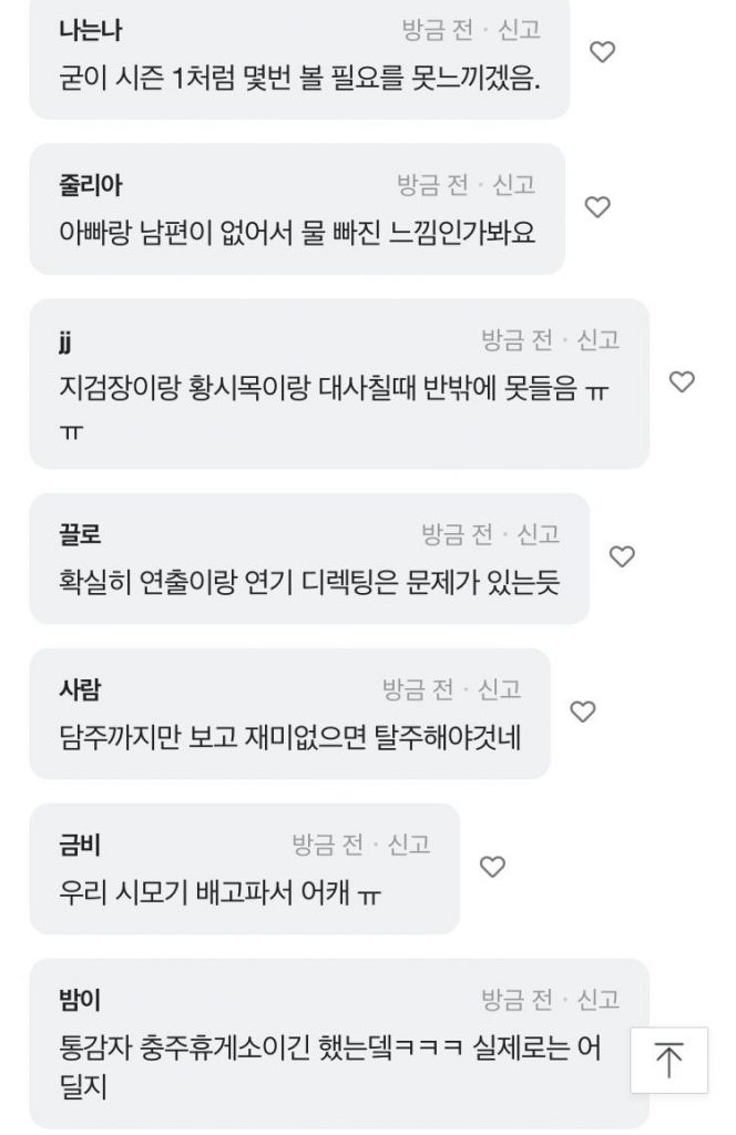 해당 댓글 반응에는 “굳이 시즌1처럼 몇번 볼 필요를 못느끼겠음”, “지검장이랑 황시목이랑 대사칠 때 반밖에 못들음ㅠㅠ”, “화실히 연출이랑 연기 이렉팅이 문제가 있는 듯”, “담주까지만 보고 재미없으면 탈주해야겠네”, “감자는 왜 나온거지” 등의 반응을 보이고 있다.