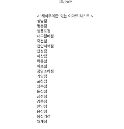 ‘채식주의존’이 있는 이마트 점포는 성남점, 평촌점, 영등포점, 대구월배점, 죽전점 등 전국 21개 점인 것으로 조사됐다.