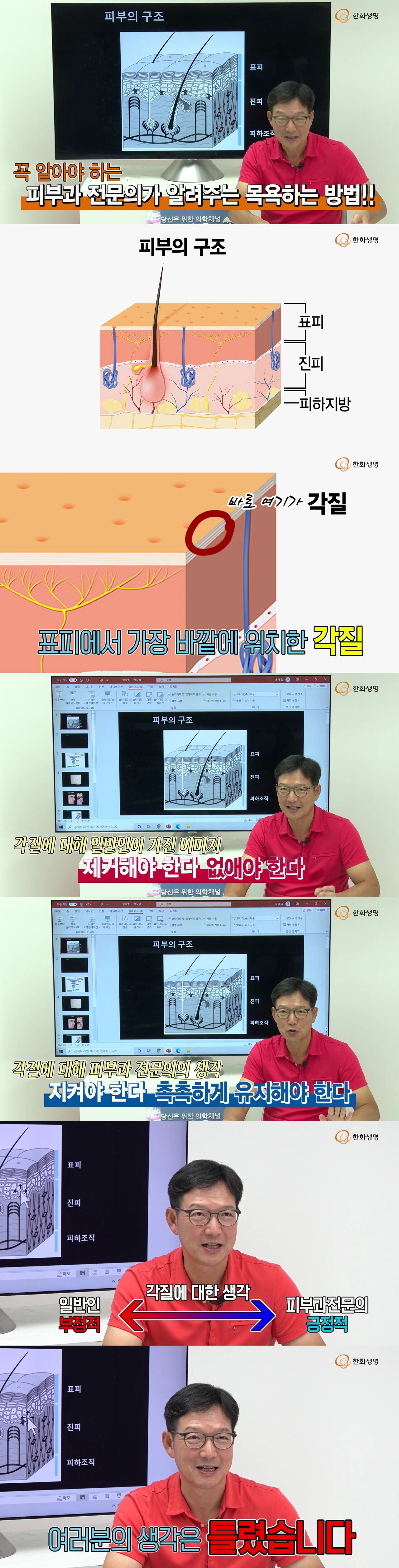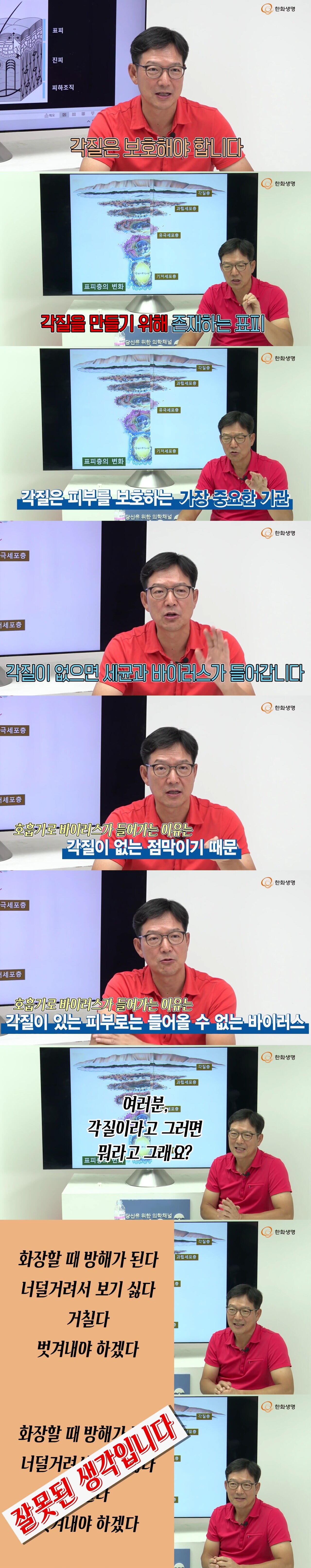 방송에 출연한 피부전문의 함익병은 “표피에서 가장 바깥에 위치한 각질을 많이들 제거하시는데 절대 그러시면 안 됩니다.”라며 이야기를 시작했다.