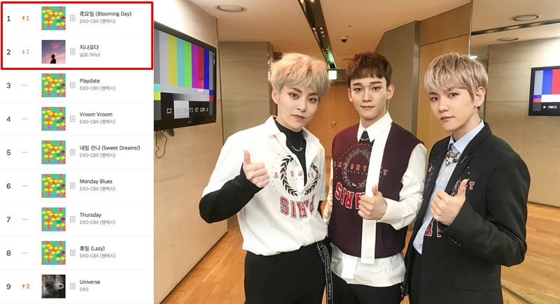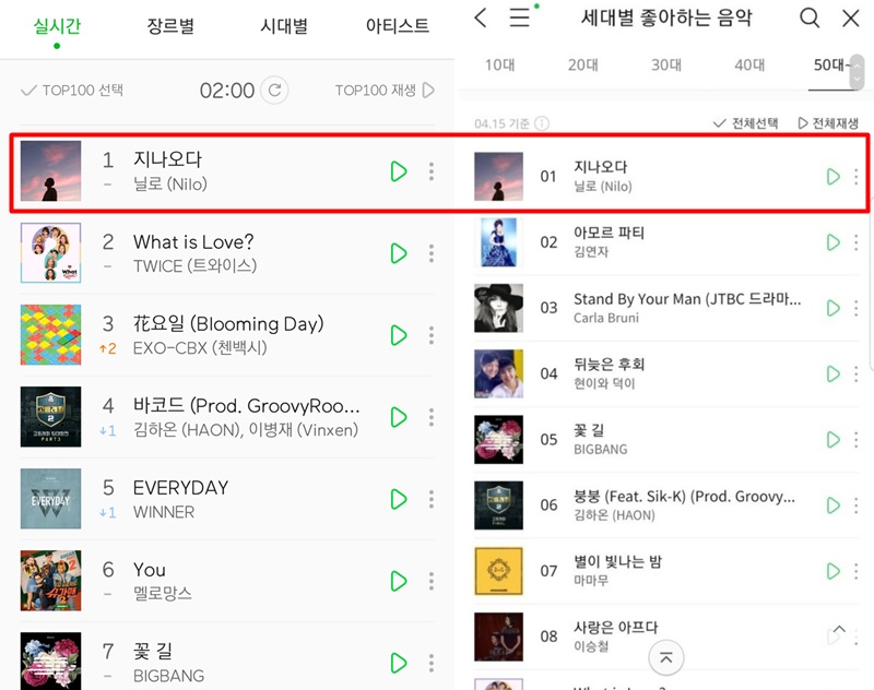 사진에는 그동안 1위를 지키던 닐로의 ‘지나오다’가 2위로 내려갔고, 엑소-첸백시의 ‘花요일 (Blooming Day)’이 1위에 머무르고 있는 것을 확인할 수 있다.