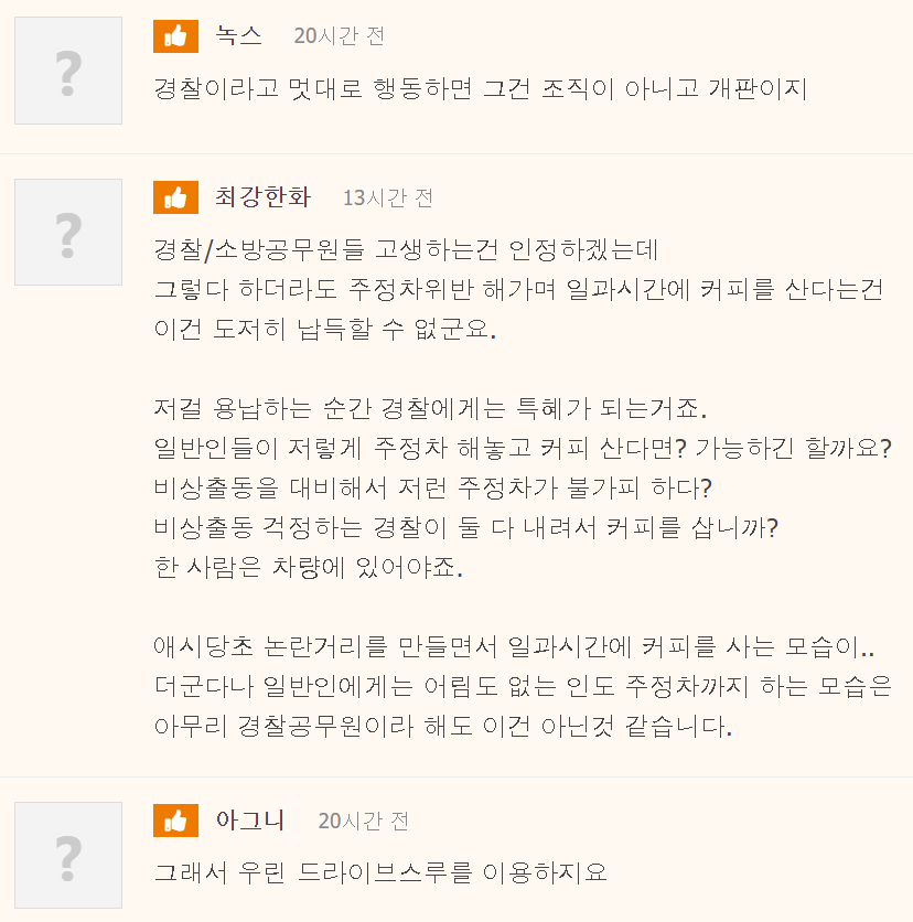 최근 온라인 커뮤니티에 올라온 “커피 사러 온 경찰 논란”이라는 제목의 게시글이 화제다.