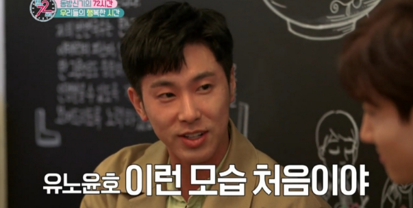 그러자 유노윤호는 얼굴이 급격히 빨개지며 술기운이 올라오는 모습을 보여주었고, 최강창민은 “너무 무리 하는거 아니냐?”며 유노 윤호를 걱정하는 모습을 보였다.