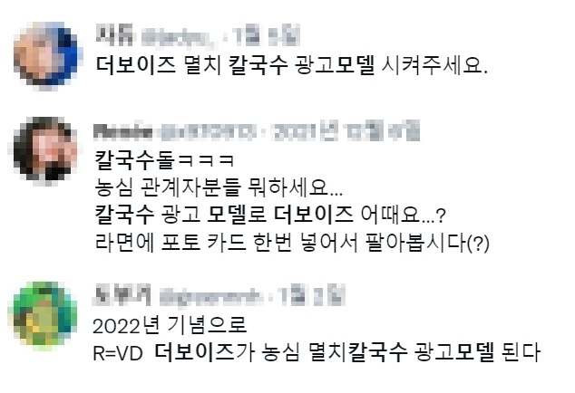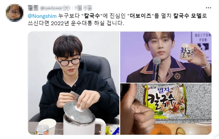 이후 해당 트윗을 본 농심 담당자가 더보이즈를 멸치칼국수의 모델로 전격 발탁했다는 놀라운 소식이 전해졌다.