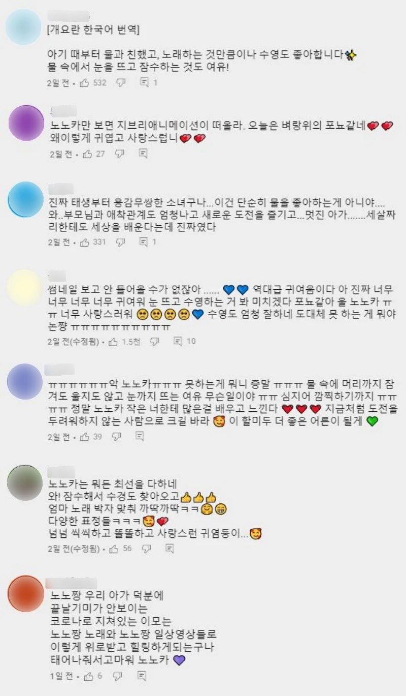 노노카는 물속에서 눈을 뜬 채로 숨을 참고 오래 헤엄치기도 했으며, 중간중간 엄마와 대화하고 꺄르르 웃음을 터뜨리는 등 즐거워하는 모습을 보였다.