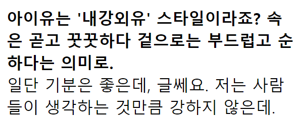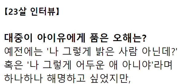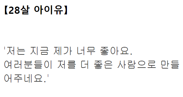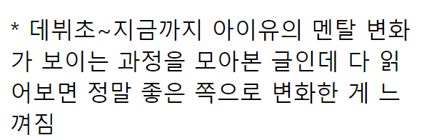 중학생이었던 데뷔 초부터 지금의 20대 후반의 나이까지, 아이유의 멘탈 변화가 보이는 과정을 보아본 글을 함께 살펴보도록 하자. 글을 보면 정말 좋은 쪽으로 생각이 변화한 것이 느껴진다고.