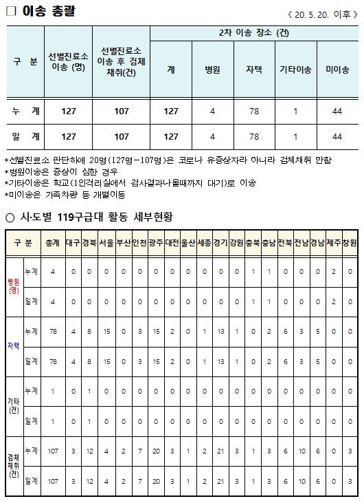 소방청에 따르면 이날 등교했다가 발열 및 인후통 등 코로나19 의심 증상을 보여 119구급대에 의해 선별진료소로 옮겨진 인원 수는 127명이다.