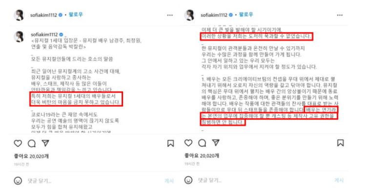 김소현 외에도 박칼린, 최정원, 남경주와 같은 뮤지컬계 배우 및 감독 관계자들도 입장을 내비치고 있는 상황이다.