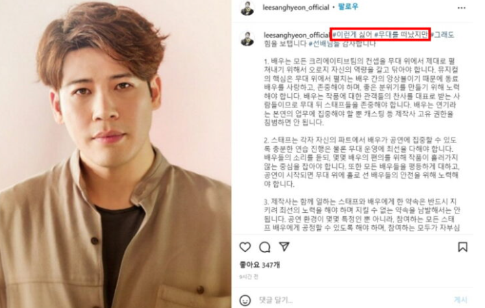 또한 동료 배우 이상현도 ”#이런게 싫어 무대를 떠났지만 그래도 힘을 보탭니다”라 작성했다.