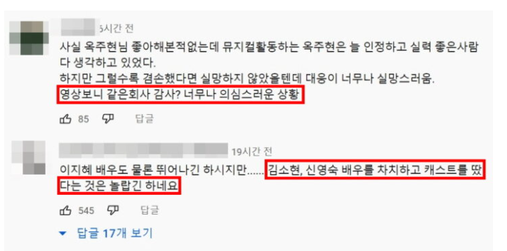 이 상황을 본 네티즌들은 ”소속사 같이 나올 때부터 알아봤다” ”뮤지컬 배우가 감사? 이름 뿐인 자리일 것 같다. 친하니까 옆에 두는 듯”, ”노래부르고 연기하는 사람이 감사 자리가 왠 말이냐”라 댓글을 남겼다.