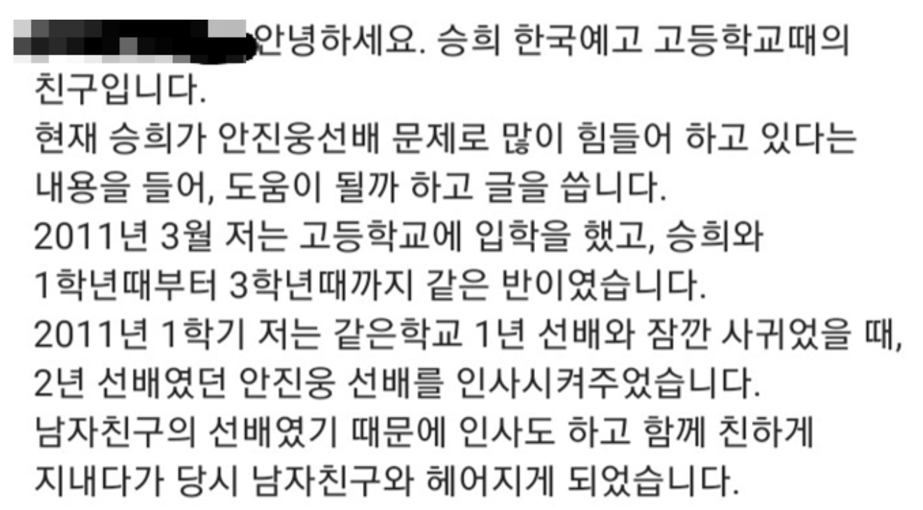 또 고등학교 동창에 승희의 고등학교 동창이자 탱크의 학교 후배인 A씨는 9일 “승희가 안진웅 선배 문제로 많이 힘들어하고 있다는 내용을 들어 도움이 될까 하고 글을 쓴다”며 말문을 열었다.