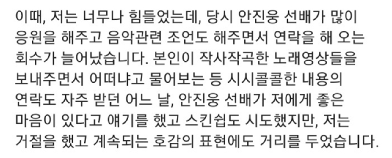 악마에게 시달리는 것 같았던 그 때가 10년이 지난 지금도 생각이 난다”며 “10년 전에 나에게 했던 행동을 아직도 반성하지 않고, 현재는 승희가 나보다 더 심하게 안진웅 선배에게 시달리고 있는 것 같아서 승희에게 조금이나 도움이 되고자 이 글을 쓴다”고 글을 마무리했다.