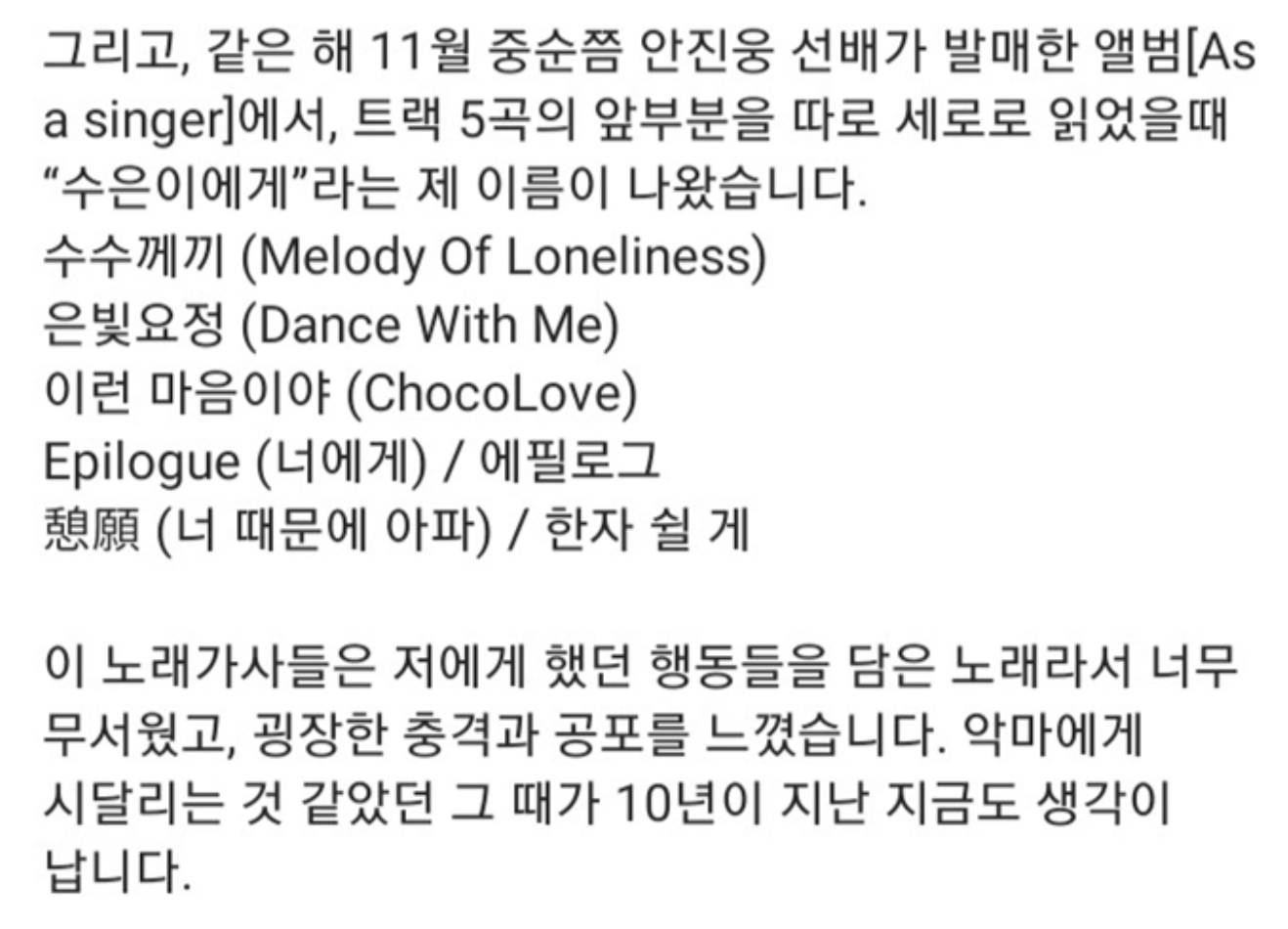 마지막으로 A씨는 “이 노래 가사들은 나에게 했던 행동들을 담은 노래라 너무 무서웠고 굉장한 충격과 공포를 느꼈다.