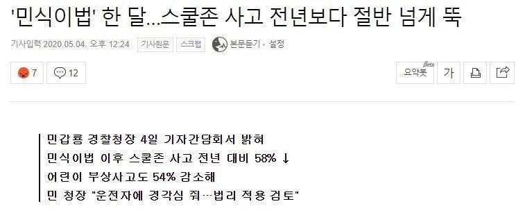 그 기사에는 ‘민갑룡 경찰 청장’이 지난 4일 출입기자단과의 정례간담회에서 민식이법과 관련, “어린이 방지턱 보호구역에서 교통사고로 인한 어린이 부상사고는 전년 동기 대비 58%가량 감소했다”며 “다친 어린이도 54% 정도 줄었다”고 말했다고 나와있었다.