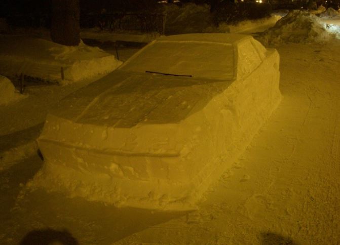 그는 길거리에 나가 눈을 이용해 자동차를 뚝딱 완성했다.