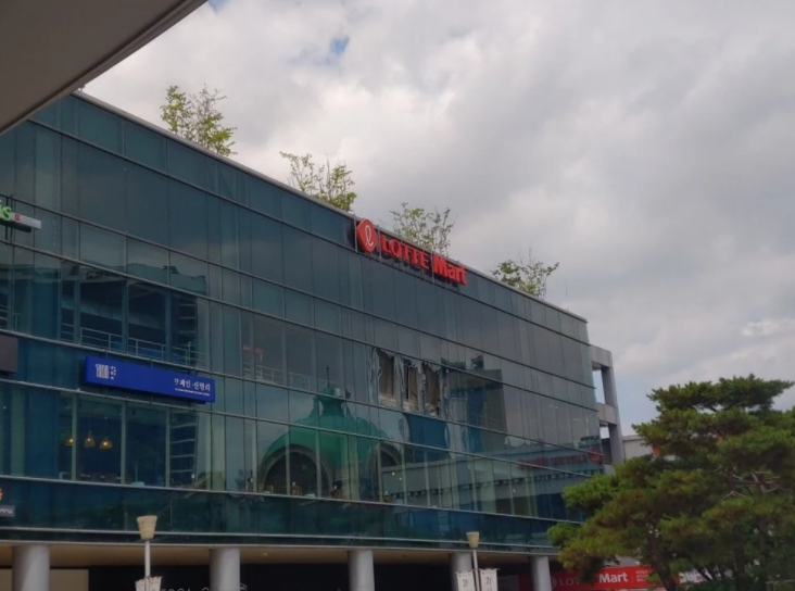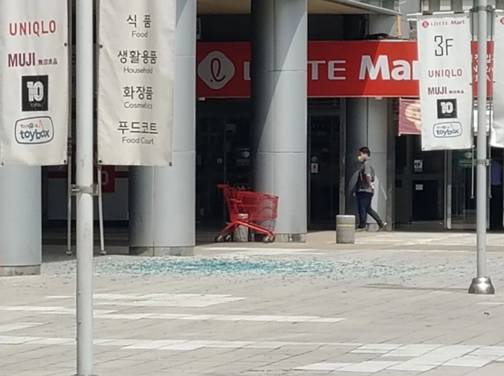 그가 게재한 사진에는 롯데마트 서울역점의 유리벽 3개가 깨진 모습이 담겨있으며, 건물 바닥에는 유리 조각들이 널브러져 있다.