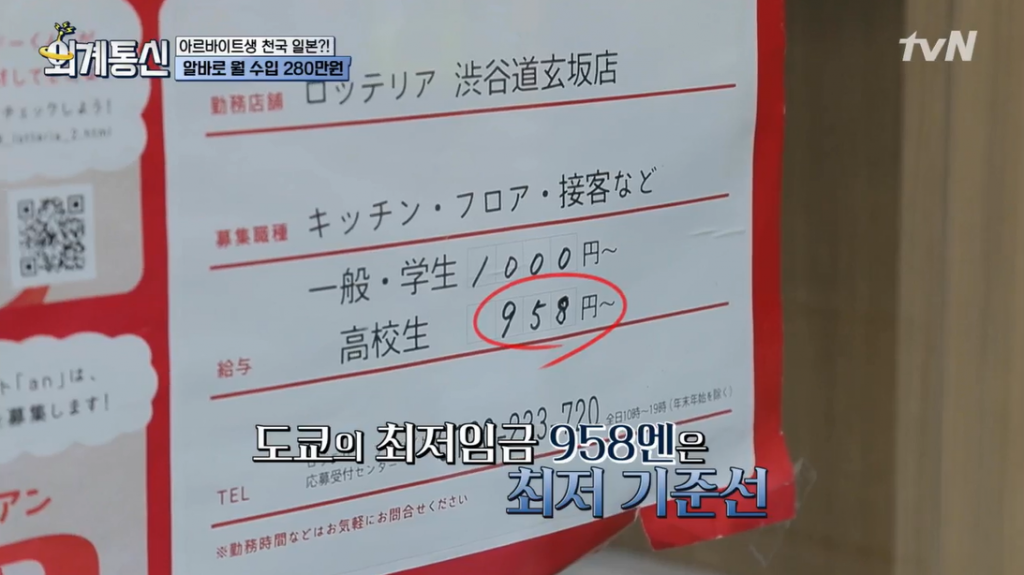 카즈야씨 사례 외에도 방송에 공개된 일본 도쿄의 매장은 최저시급보다 훨씬 높은 시급을 제시하며 사람을 구하고 있었다.
