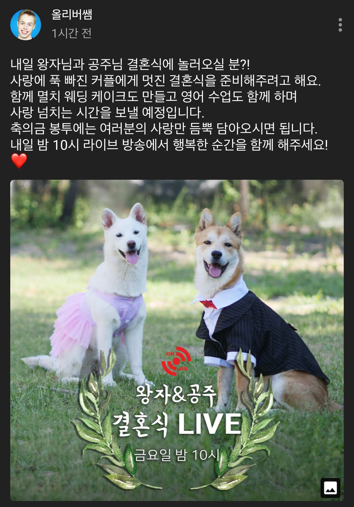 바로 현재 올리버쌤이 키우고 있는 반려견 왕자와 공주의 결혼 소식이었다.