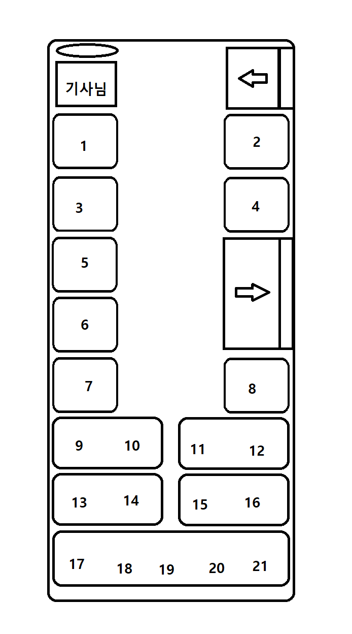 사진에는 기사님, 그리고 숫자 1부터 21까지로 좌석을 구분해 버스에서 가장 선호하는 좌석을 고를 수 있었다.