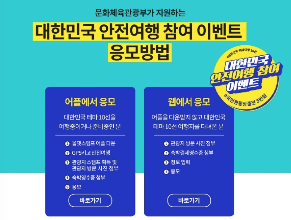 테마여행지에서 숙박여행 여부를 인증하면 5만원권 국민관광상품권을 주는 ‘대한민국 안전여행 참여 이벤트’가 오는 10월까지 진행된다.