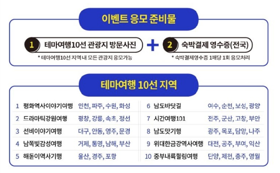 ‘테마여행 10선’ 홈페이지 또는 앱에 여행지에서 마스크를 착용하고 촬영한 사진, 그리고 숙박 이용을 증명하는 영수증 캡처 이미지를 올리면 응모가 완료된다. 모바일 숙박 앱인 ‘여기어때’를 통해서도 응모할 수 있다.
