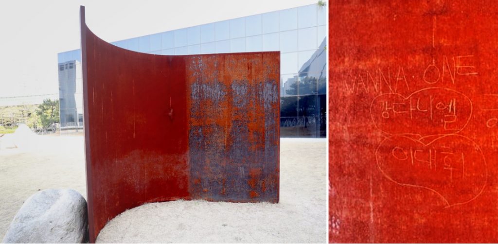 논란이 된 낙서는 이 붉은 철판에 날카로운 물체로 긁어 새기면서 만들어졌다.