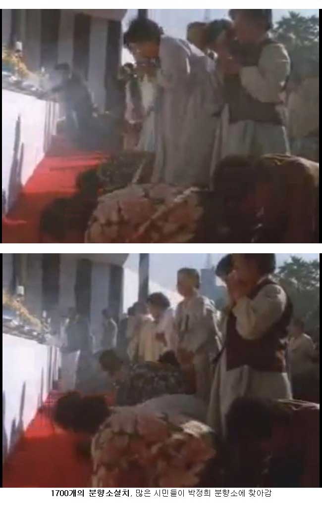 박정희 사망 소식에 TV에서는 종일 향불만 피워 올렸으며 빈소 앞에는 통곡하면서 분향하는 사람들이 줄을 서는 모습이 화면에 잡혔다.