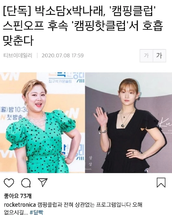 그는 ‘캠핑핫클럽’ 기사를 캡처한 사진과 함께 “캠핑클럽과 전혀 상관없는 프로그램이다. 오해 없으시길…#딮빡”이라고 말했다.