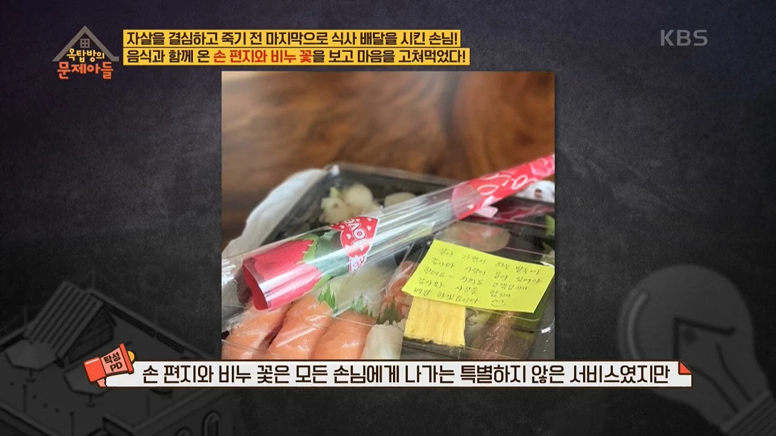 사연에 따르면 ‘극단적 선택’을 결심하고 죽기 전 마지막으로 식사 배달을 시킨 손님이 ‘이것’을 보고 마음을 고쳐먹었다고 한다.