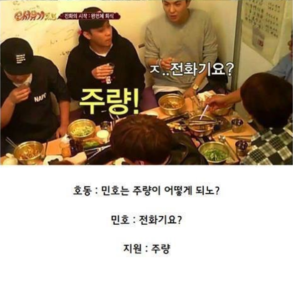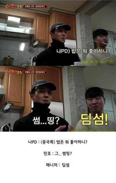 옆에 있던 매니저가 딤섬 이라고 정정을 해주어 그제서야 모두들 민호의 대답을 이해했다.