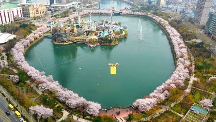 123층짜리 롯데월드타워를 배경으로 벚꽃이 만발한 석촌호수의 모습은 눈을 뗄 수 없을 만큼 아름답다.