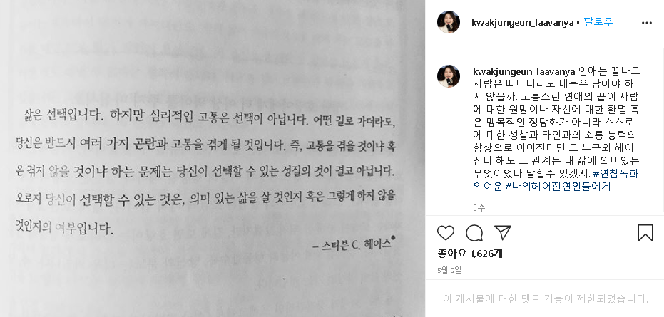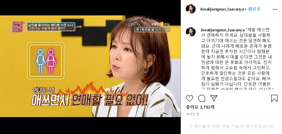 곽 씨는 “제발 애쓰면서 연애하지 마세요”라며 “상대방을 사랑하고 아끼기에 애쓰는 것은 당연히 해도 된다. 그러나 내게 해로운 관계가 분명한 것을 알면서도 지금껏 투자한 시간이나 정 때문에 놓지 못해서 애를 쓴다면 그건 내 인생에 대한 큰 후회로 이어진다”라고 말했다.