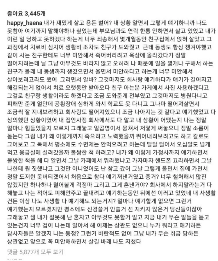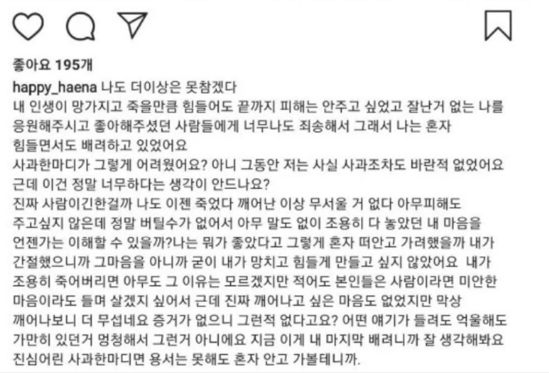 해나는 자신의 인스타 그램에 장문의 글을 올렸는데 글 속에는 “내 인생이 망가지고 죽을 만큼 힘들어도 끝까지 피해는 안 주고 싶었고 잘난 거 없는 나를 응원해 주는 사람들에게 죄송해서 혼자 참고 있었다. 사과 한 마디가 그렇게 어렵냐”라는 내용이 담겨있었다.
