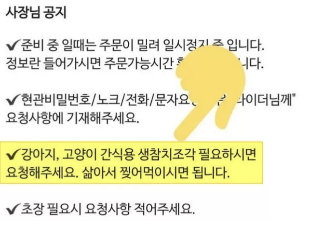 해당 참치집 사장님은 배달 앱에 “강아지, 고양이 간식용 생참치 조각이 필요하시면 요청해주세요. 삶아서 찢어 먹이시면 됩니다”라고 메모해 두었다.
