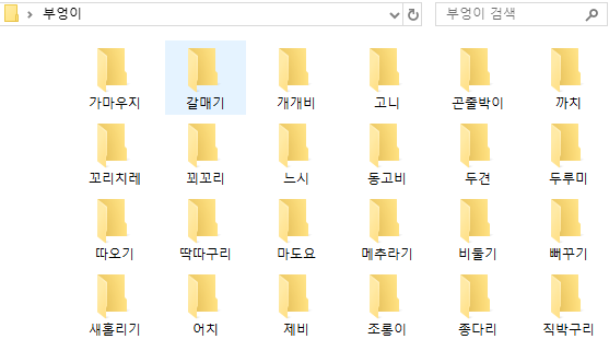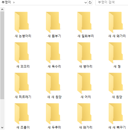 까치, 갈매기 처럼 친숙한 새부터 직박구리, 새홀리기 같이 생소한 새까지 다양한 새 이름의 폴더가 만들어진다.