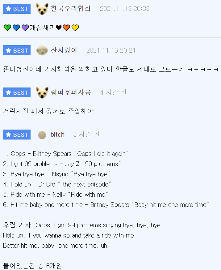 해당 사건을 본 온라인 커뮤니티 네티즌들은 “글쓴이님이 이해를 잘 못하신 것 같네요. 저거는 2002년대 인기 팝송들을 추억하는 의미로 만든 가사입니다. “, “어우 글쓴이 글 보다가 답답해서 죽을 뻔 했다.”라는 반응을 보였다.