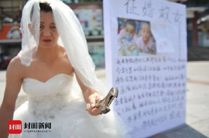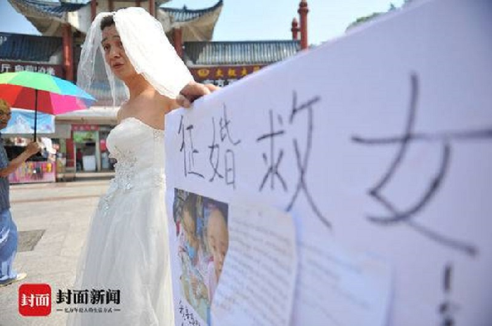 궈씨가 들고 있는 안내판에는 “나를 ‘신부’로 데려가 줄 사람을 구합니다. 딸을 살리기 위해 돈이 필요합니다. 도움을 주신다면 평생에 걸쳐 보답하겠습니다”라고 쓰여 있다.