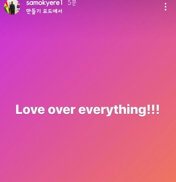 그리고 최근 샘 오취리는 인스타그램 스토리에 ‘Love over everything’이라고 하며 자신이 지적받은 내용에 대해 해명하며 사과했다.