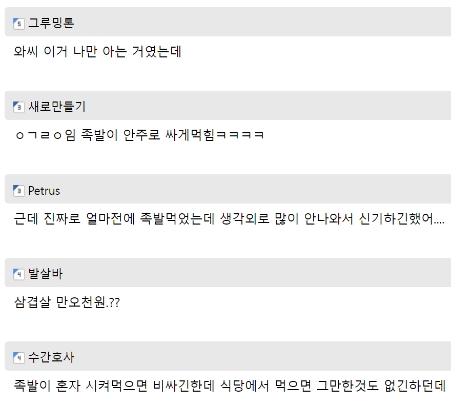 이어서 글쓴이는 “그럴 때는 친구와 족발집에 가서 족발을 시키고 포장까지 해서 친구한테 주면 삼겹살을 먹는 가격보다 저렴하게 고기를 대접할 수 있습니다.”라고 말을 덧붙였다.