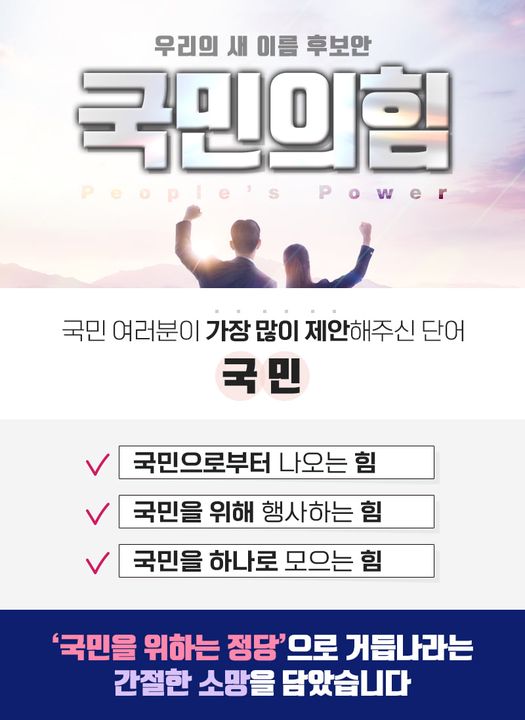 당명 교체 작업을 총괄한 김수민 홍보본부장은 탈이념에 초점을 맞췄다며, 공모로 ‘국민·자유·한국’이라는 단어를 선정했고, 그 중 진영 색채가 가장 약한 국민을 당명에 넣기로 결정했다고 밝혔다.