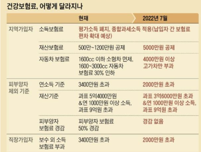 까다로워지는 피부양자 자격 요건을 보면, 먼저 재산기준 자격요건은 과세표준 3억6000만원 이하(3억6000만~9억원인 경우엔 연간 합산소득 1000만원 이하)로 바뀌는데현재 5억4000만원인 과세표준 기준이 크게 낮아지는 것이다.