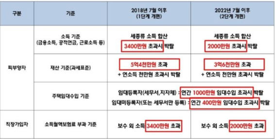 소유한 재산(토지, 건축물, 주택, 선박 및 항공기)의 과세표준액이 9억원을 넘거나연간 합산소득이 1000만원을 넘으면서 과세표준액이 3억6000만원 초과하면 피부양자을 잃게 된다고 한다.