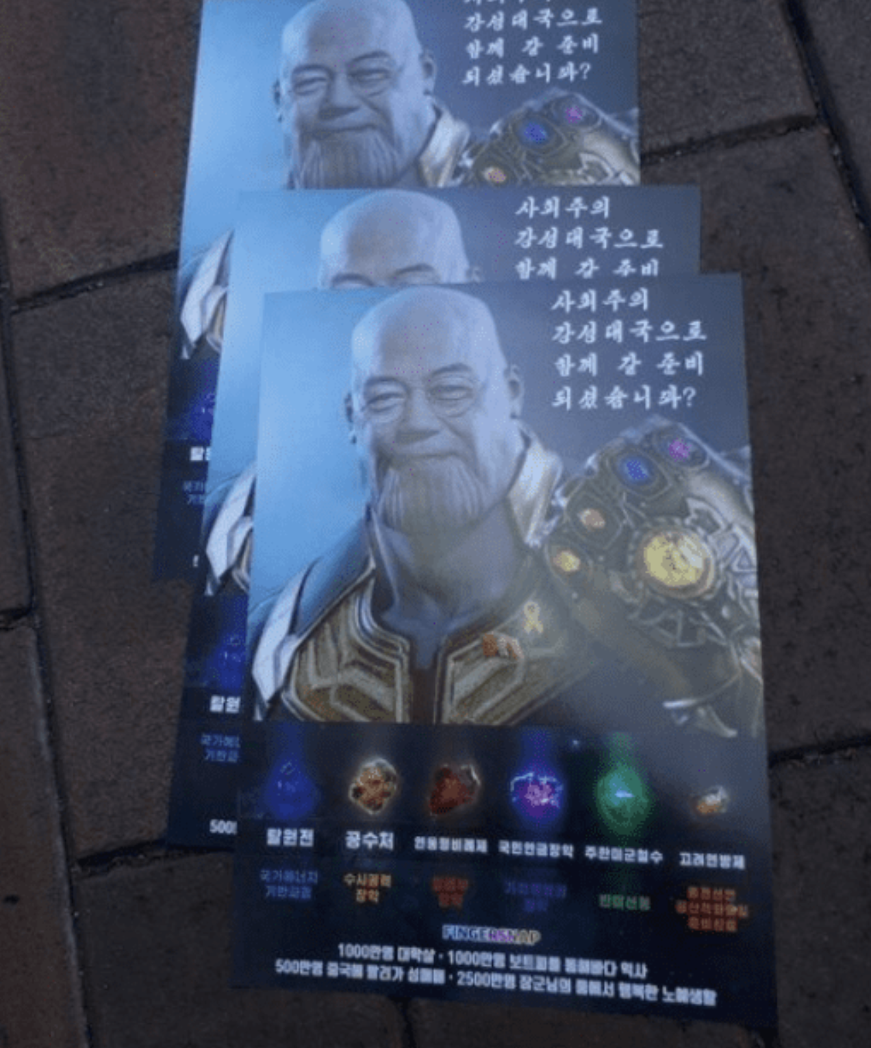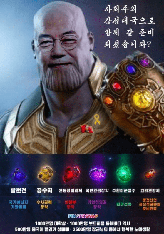 배포된 전단지에는 영화 어벤져스에 악당으로 나오는 ‘타노스’ 모습에 문재인 대통령 얼굴이 합성되어 있었다.