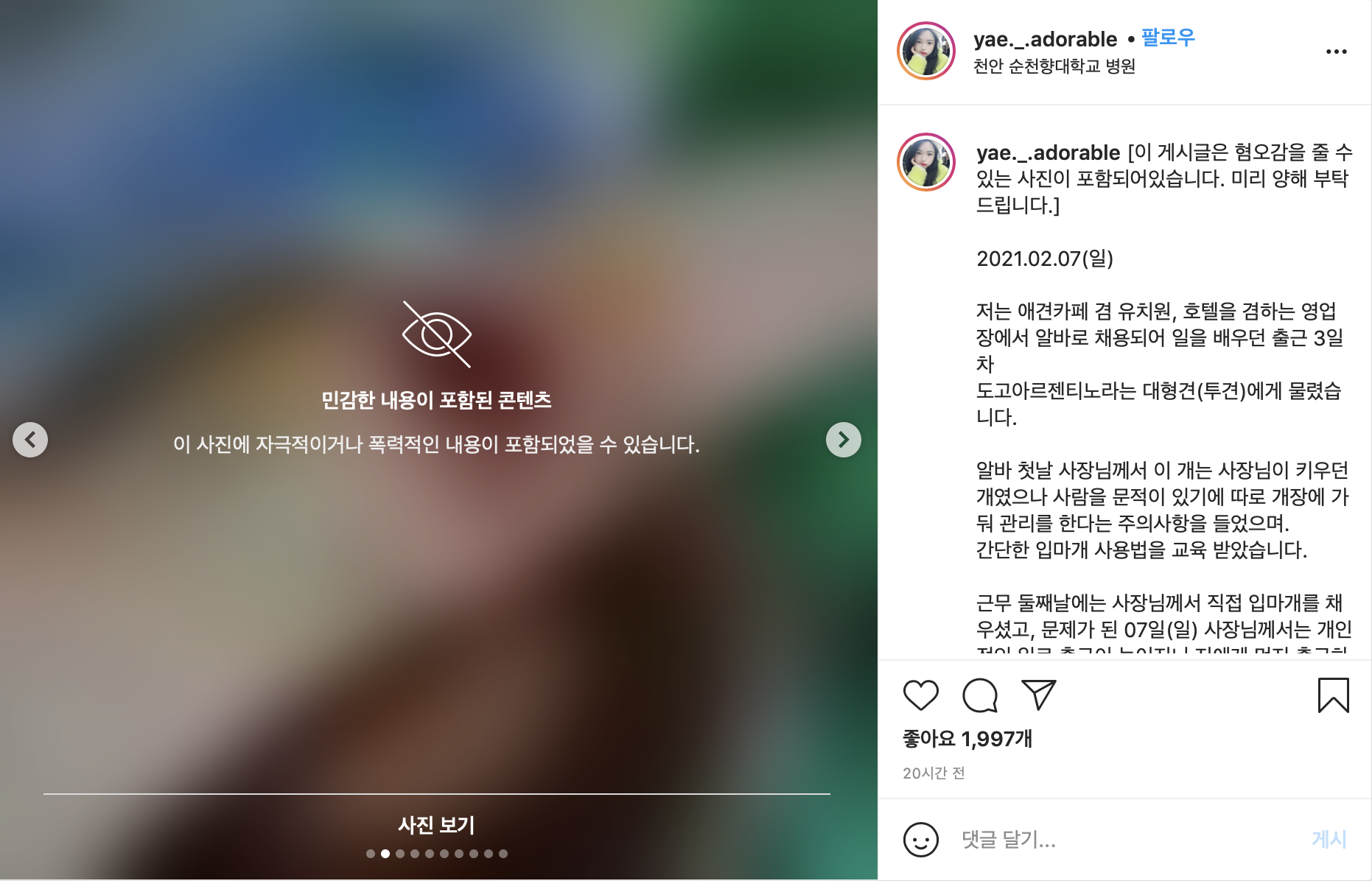 최근 한 온라인 커뮤니티에는 ‘애견카페에서 자기 대형견한테 물린 알바생 모른척하는 사장’ 이라는 제목의 글이 올라왔다.
