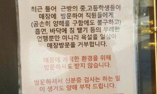 주로 음식점이 이러한 예이며, 해당 상점들에서는 ‘본 가게는 n세 미만 어린이 및 초등학생 입장이 불가하며 보호자와의 동반 입장 또한 불가합니다’ 등의 안내문을 앞에 써 붙여 놓는다.